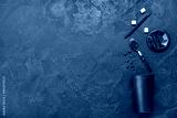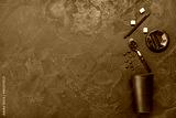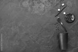 Composition with takeaway paper cup with coffee beans, sugar cubes and straws on black background