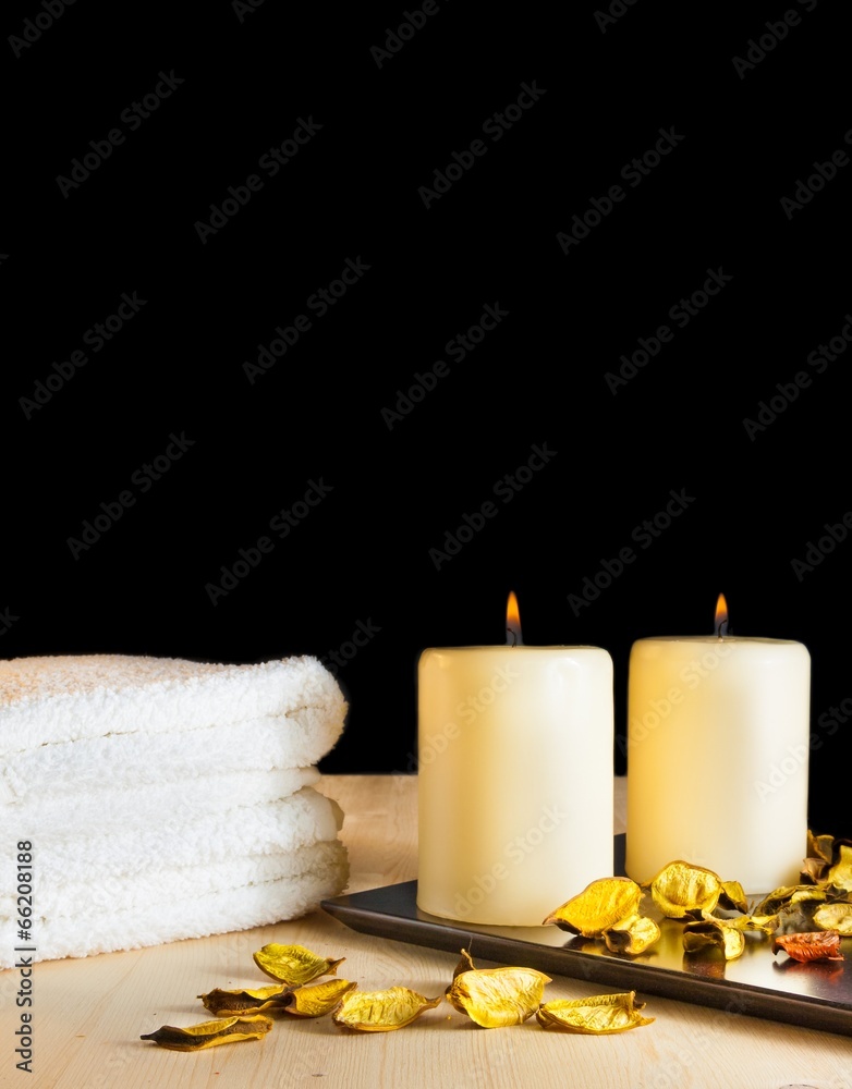Spa massage with towel stacked, perfumed leaves and candles