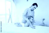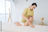Portrait of positive female doctor doing shoulder and back massage toddler baby lying in home crib. Side view of professional masseuse giving massage to happy child. Concept of childhood, motherhood.