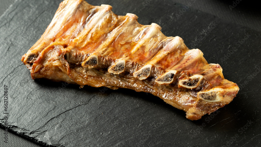 pork ribs with spices on a black background. the concept of recipes and restaurant menus