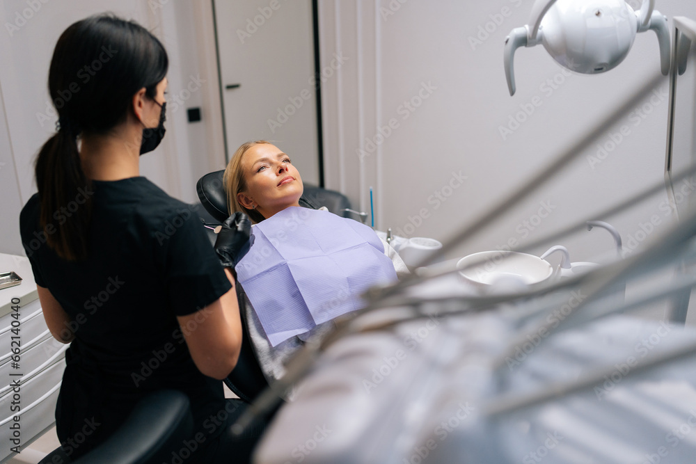 Remote rear view of unrecognizable female dentist examining and treats teeth of blonde female client lying on dental chair in dentistry clinic. Concept of stomatology, dentistry and orthodontics.