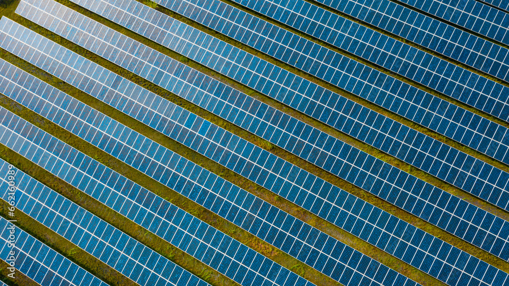Solar Photovoltaic of solar farm aerial view, solar plant rows array of on the water mount system Installation in earthen pond, Floating solar or floating photovoltaics (FPV). evening sky