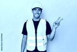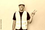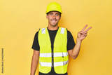 Latino worker in yellow vest and helmet joyful and carefree showing a peace symbol with fingers.