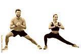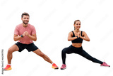 Warm-up people train a male instructor and a female client. Active exercises squats in fitness clothes. Sports friends have an intense time for sports. Transparent background.