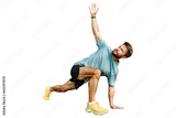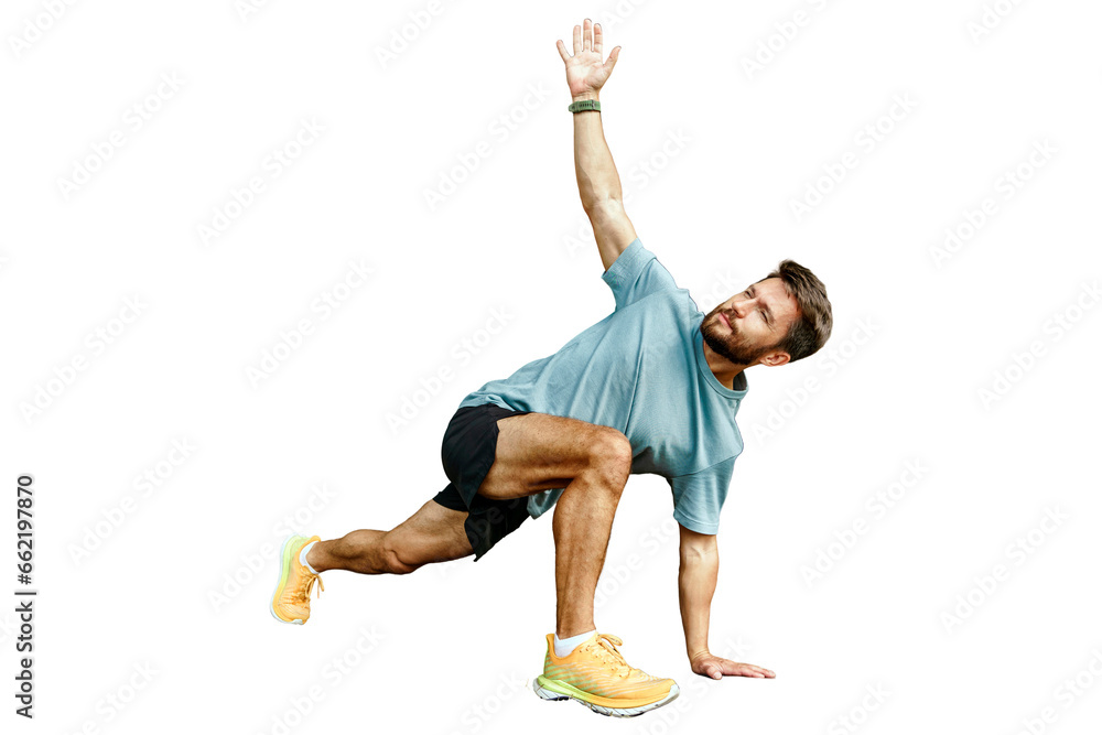 A happy man sports a slim body. Exercises plank workout fitness strong man. Warm-up yoga pose asana. Mental and psychological health. Transparent background.