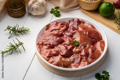 Flesh raw chicken liver meat in white plate, ingredients for cooking