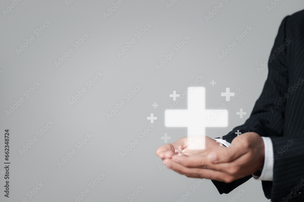 Positive thing by plus sign concept. Businessman showing positive thing, business for profit, benefit, health insurance, development and growth.