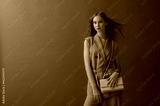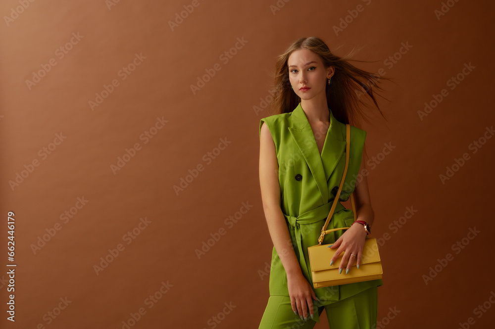 Fashionable confident woman wearing trendy green waistcoat, trousers, carrying stylish yellow faux lather shoulder bag, posing in studio, on brown backdrop. Copy, empty space for text