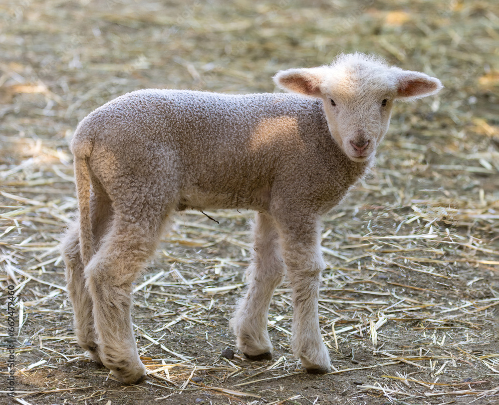 Lamb posing inside sheep pen. Farm in Northern California, USA.