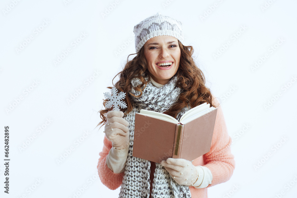 smiling female in sweater, mittens, hat and scarf on