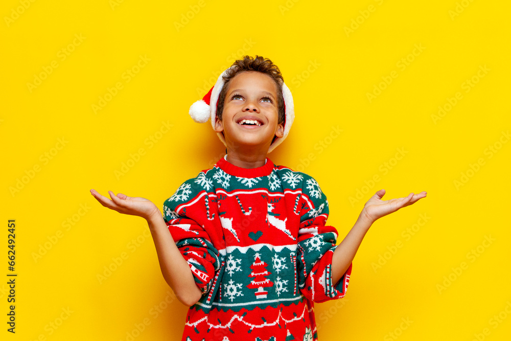 cheerful african american boy in christmas clothes holds empty hands and looks up on yellow isolated background