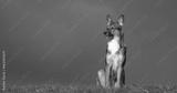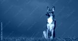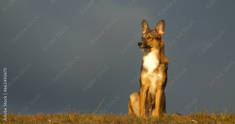 PORTRAIT Adorable mixed breed dog sits calmly on grassy hilltop in morning light