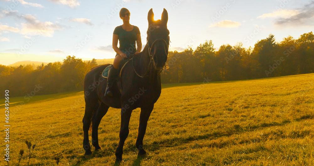 PORTRAIT, LENS FLARE: Smiling young lady in saddle on a beautiful brown horse