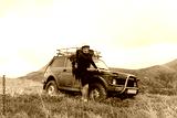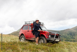 male tourist with backpack and hiking equipment with car in the mountains against the background of landscape