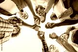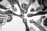 group of multiracial young people clink beer bottles outdoors, interracial students celebrating toast and relaxing