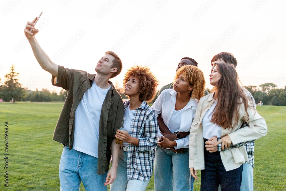 group of multiracial young people take selfies on smartphone and take pictures in the park, interracial students