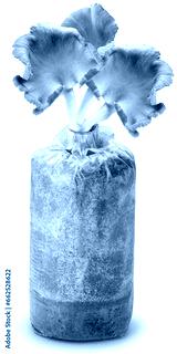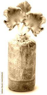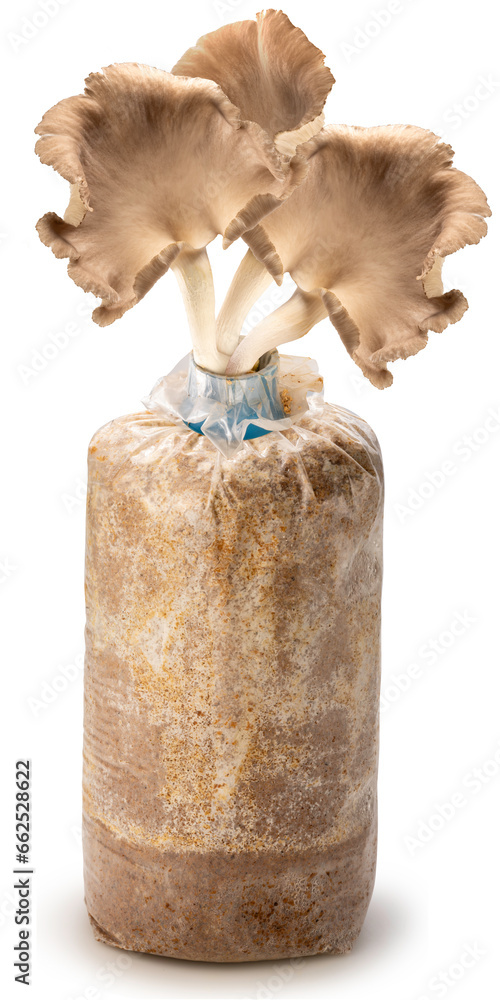 Mushrooms on Bag container with inoculated mycelium of mushrooms isolated on white background, Mushroom growing kit on White Background With clipping path.
