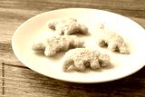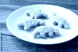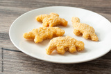 A view of a plate of dinosaur chicken nuggets.