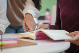 Learning with friends Young students campus.High School Tutor for examining helps school homework together with friend catching up and learning