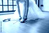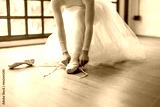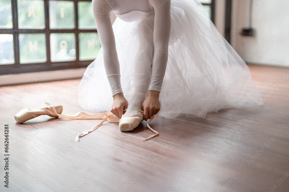 Ballerina in ballet shoes. Asian girl tying ribbons of toe shoes. ballet dancer preparing and wearing ballet shoes in dance studio prepares for a rehearsal.