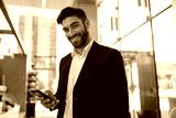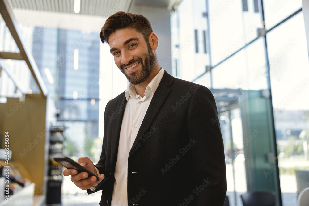 Male manager holding mobile phone and looking at camera with smile standing on office background