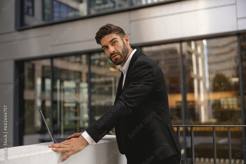 Stylish male manager working on laptop standig on office terrace. High quality photo