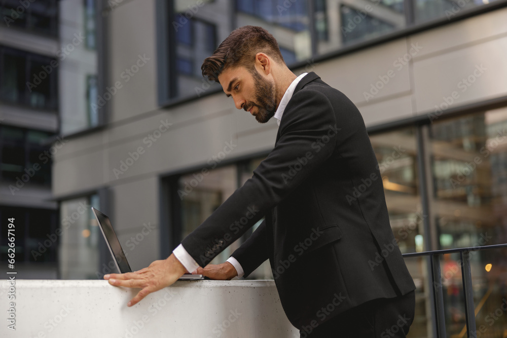 Stylish male manager working on laptop standig on office terrace. High quality photo