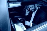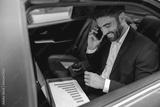Handsome businessman in suit using personal computer and making phone call in taxi