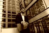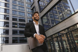 Stylish male manager standing with laptop on office terrace and looks away. High quality photo