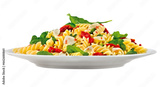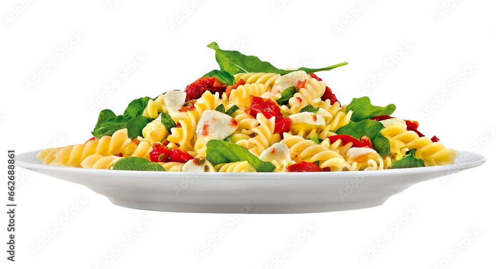 prato com macarrão penne ao molho de manteiga com tomate seco, rúcula e queijo branco isolado em fundo transparente