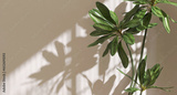 Green decorative tree in sunlight from window, leaf shadow on beige brown wall room. Luxury organic cosmetic, skincare, body care, beauty product background, interior design decoration 3D