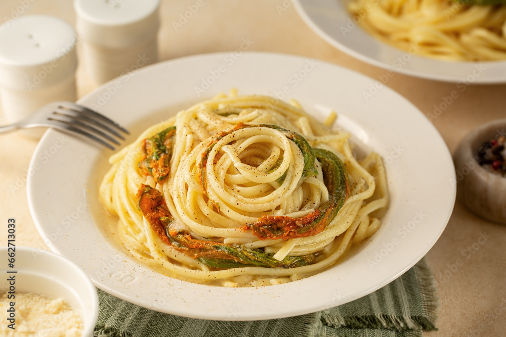 Italian pasta, Spaghetti with zucchini flowers, black pepper and cheese.