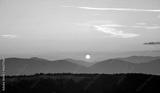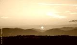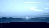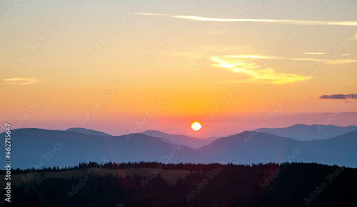 Colorful clouds in the sky at sunset against the backdrop of a mountainous forest area.