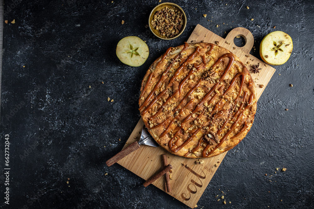 Homemade Organic Apple Pie with caramel and nuts Dessert on a dark background. top view. place for text