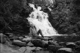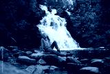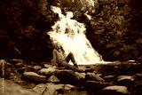 a young beautiful woman tourist sitting against the backdrop of a waterfall surrounded by forest