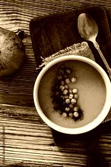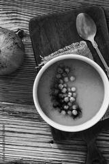 Bowl with vegan pumpkin and chickpea cream soup on wooden table, directly above