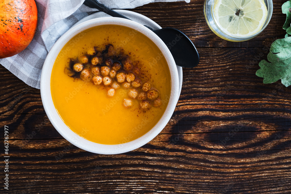 Bowl with vegan pumpkin and chickpea cream soup on wooden table, directly above