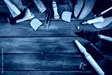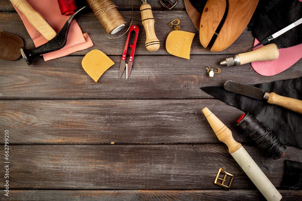 Leather workshop tools on the table. Handbag or shoe manufacturing industry