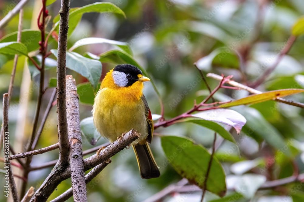 An adult silver-eared mesia, Leiothrix argentauris, is a small and colourful species of bird endemic to South East Asia. Perched on a branch and with a foliage background.