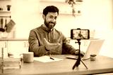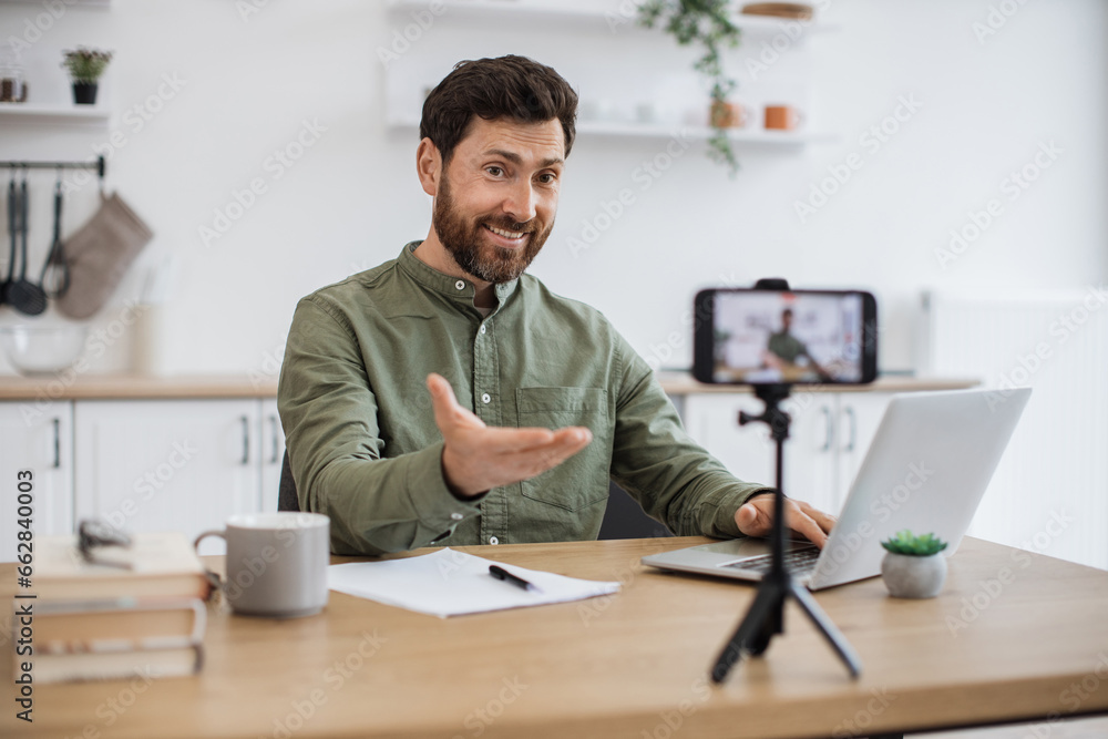 Confident bearded man sitting at desk and working on wireless laptop while recording video on modern smartphone fixed on tripod. Male freelancer creating new content for social media at home.