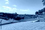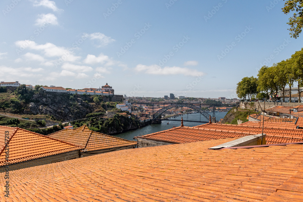 słynny most w Porto widziany tuż nad pomarańczowymi dachami kamienic