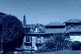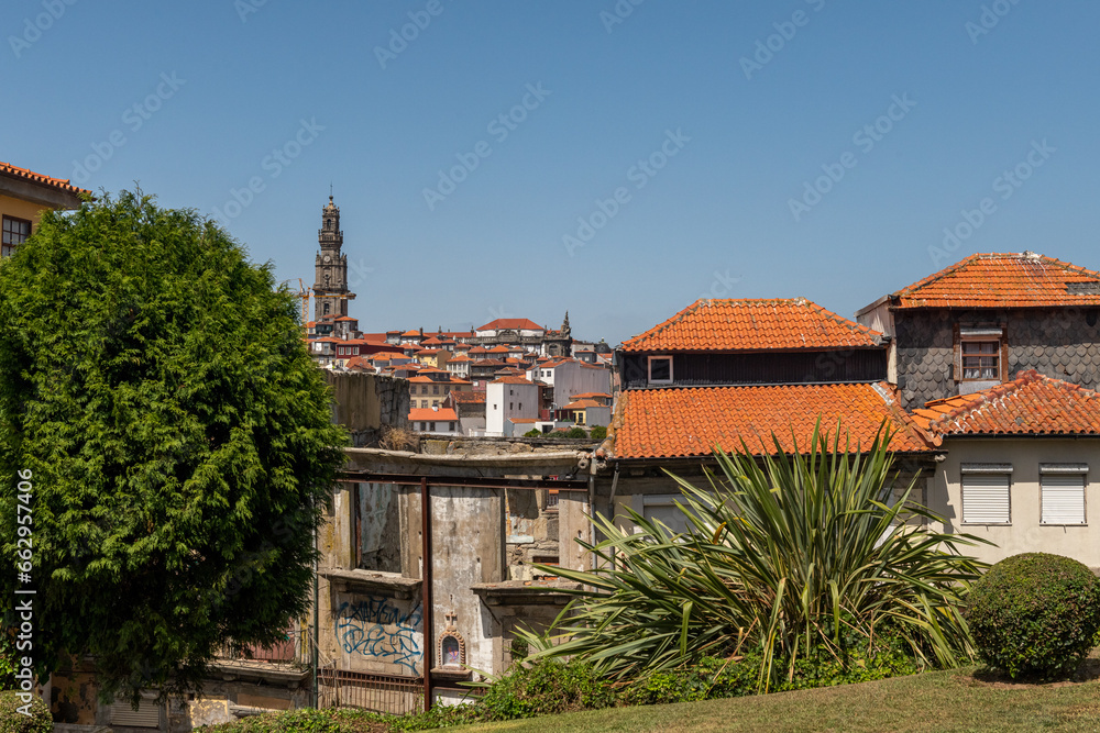 wieża katedry i pomarańczowe dachówki kamienic w Porto