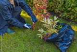 Close-up view of man pruning peony flowers in garden on autumn day. Sweden.
