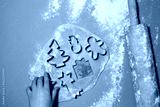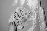 Family with kids preparing Christmas Cookies on table sprinkled with flour.