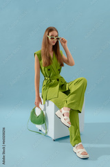 Fashionable confident woman wearing trendy green suit with waistcoat, trousers, white platform sandals, holding stylish quilted lather bag, posing in studio, on blue backdrop. Full-length portrait