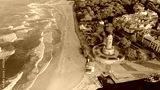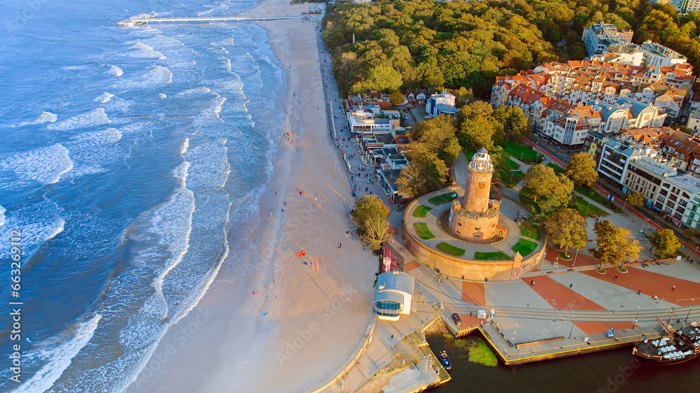 Drone photo captures Kołobrzeg's maritime charm, featuring the iconic lighthouse, cerulean sea, turbulent waves, a distant pier, and autumnal hues on the trees.
