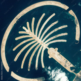 Travel, ocean and aerial of Palm Tree in Dubai for holiday, vacation and resort destination. Architecture, geography and satellite, top view and atmosphere for urban development, tourism and design