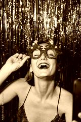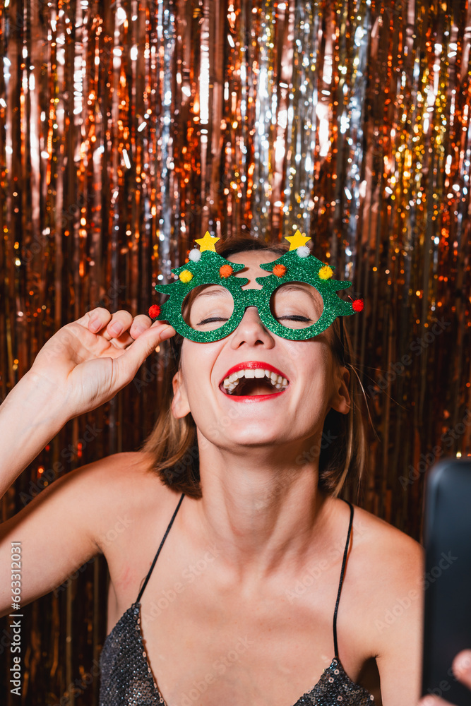 Happy woman taking selfie on smartphone celebrating New Year.