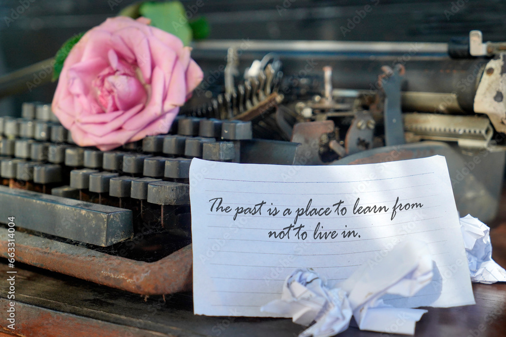 Inspirational motivational quote - The past is a place to learn from not to live in. Text message on white torn paper with pink purple flower on old typewriter vintage background.
