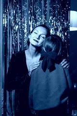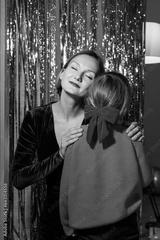 Woman hugging little girl on festive background. Mother and daughter preparing for home party.